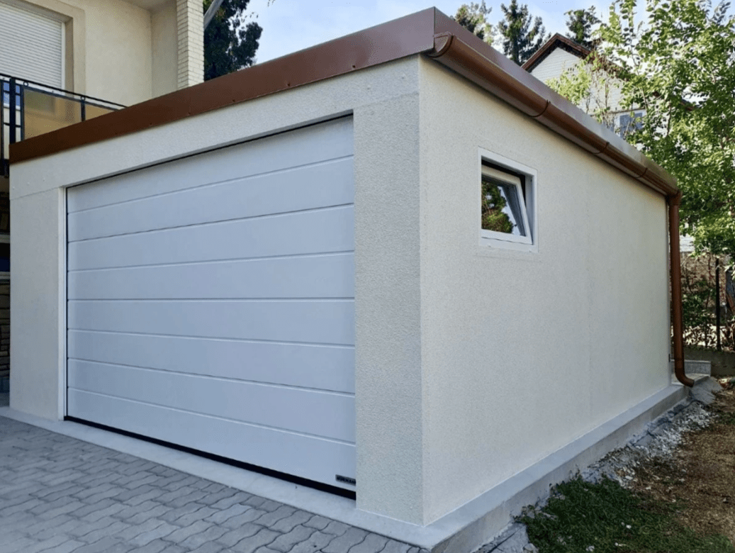 - garázskapu: Hörmann szekcionált, szigetelt kapu, motorral, távirányítóval, fehér színben (kérhető még: ezüst, antracit, aranytölgy, mahagón, dió színekben),